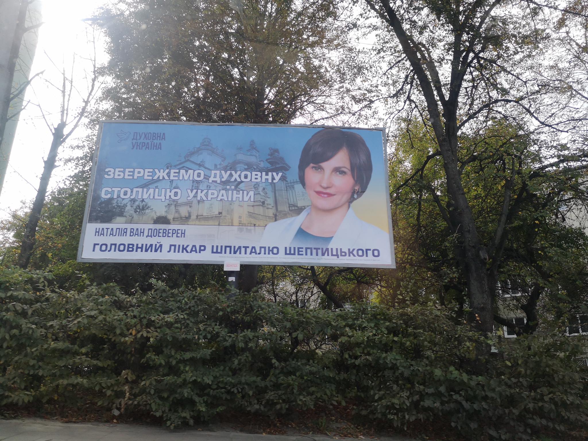 Не має ані у звіті кандидатки, ані у звіті “Духовної України” чітко зазначених статей витрат на білборди та сітілайти із зображенням Наталії Ван Доеверен. Їх спостерігачі Громадянської мережі ОПОРА фіксували у місті Львові.