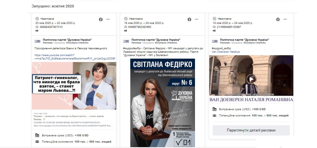Також на сторінці політичної сили у соцмережі у жовтні було опубліковано 5 рекламних постів про Ван Доеверен. На кожен допис політсила витрачала менше 100 доларів.