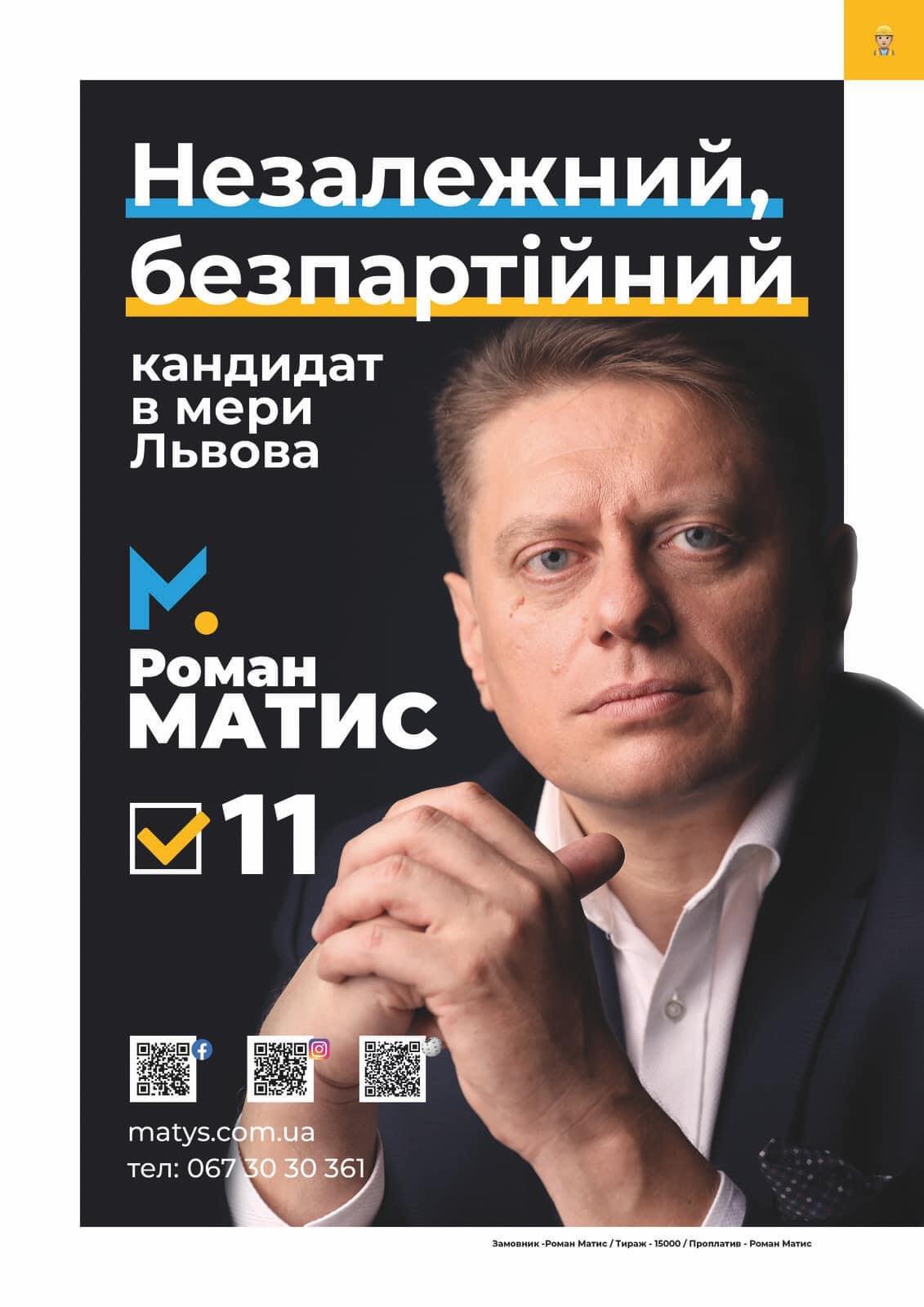 Виборчу кампанію кандидат на посаду міського голови Львова Роман Матис (самовисування) проводив лише за добровільні внески фізичних осіб. Разом - 99 010 гривень. В один день рахунок виборчого фонду Романа Матиса на однакову суму (49 594,99 гривень) поповнили Тетяна Старунська та Ірина Конончук. Загалом Матис витратив 40 764 гривень на листівки і поліграфічну продукцію.