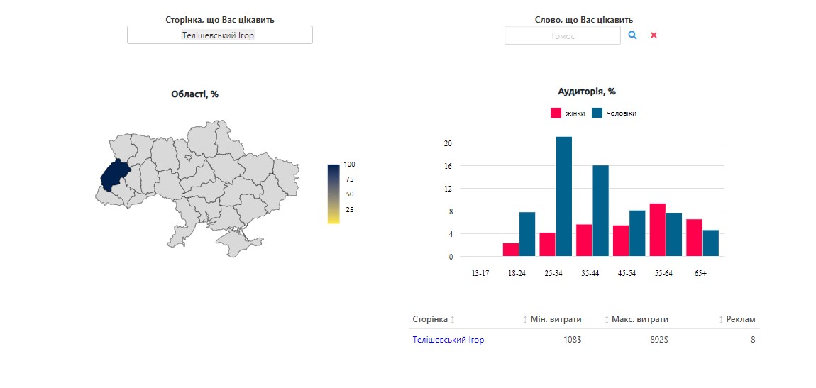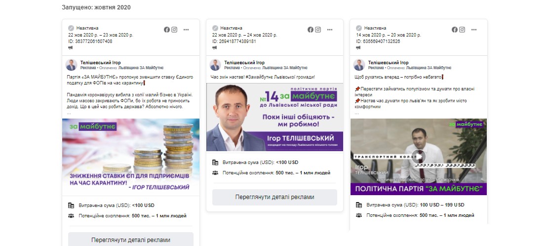 Були реклама Ігоря Телішевського і у соціальній мережі. У жовтні з пабліку кандидата рекламувалося 8 постів. За них партія “За майбутнє” заплатила орієнтовно від 108 до 892 доларів.