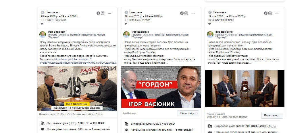 Не має серед витрат Ігоря Васюник реклами у соціальних мережах. Її зі сторінки Васюника у Facebook оплачувало приватне підприємство агенція “Партнер”. У звіті ця компанія не згадується, однак, вона могла бути посередником у розміщенні реклами у мережі Інтернет. Фінансовий документ кандидата охоплює період з 28 вересня по 25 жовтня. Впродовж цього часу з пабліку було прорекламовано 43 пости на суму від 7 433 до 12 157 доларів.
