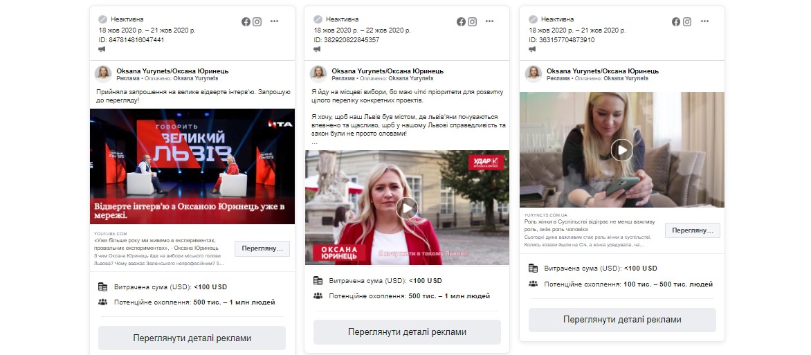 Також зауважимо, що попри те, що Оксана Юринець не мала власного рахунку виборчого фонду, на своїй сторінці у соціальній мережі з 18 по 21 жовтня Юринець прорекламувала 9 дописів. За які заплатила сама орієнтовно від 9 до 891 долара.
