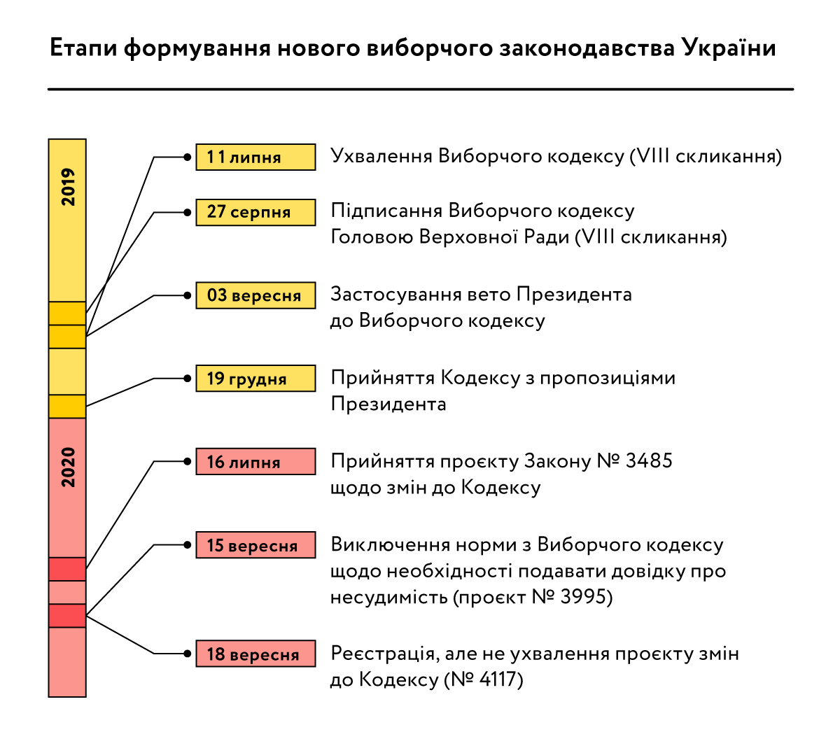 Законодавчі умови проведення місцевих виборів 2020 року були остаточно визначені Верховною Радою України 16 липня 2020 року шляхом внесення змін до Виборчого кодексу, прийнятого у грудні 2019 року з пропозиціями Президента України Володимира Зеленського. Врахування зауважень Глави держави не усунуло всіх проблем регулювання місцевих виборів і парламентська дискусія відновилась уже в 2020 р. Така послідовність дій парламенту, на жаль, не дозволила забезпечити стабільність виборчого законодавства, яке було ухвалено безпосередньо перед початком процесу місцевих виборів. Останні зміни до Виборчого кодексу були внесені вже у вересні 2020 року і стосувалися скасування необхідності для кандидатів подавати довідку про несудимість до виборчих комісій. Незважаючи на запізнене ухвалення законодавства, ОПОРА високо оцінює впровадження Комітетом Верховної Ради України позитивних практик взаємодії з національним експертним середовищем та міжнародними організаціями під час напрацювання змін до Виборчого кодексу.