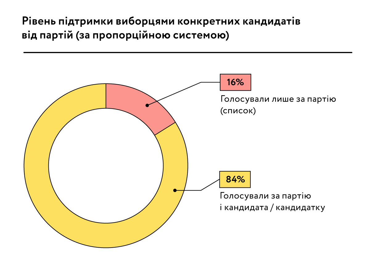 Також запропонована виборча система виявилася результативною в контексті реалізації опції щодо добровільного голосування виборців за конкретних кандидатів від політичних партій. Так, 84% виборців факультативно відмічали в бюлетенях кандидата/-ку, якого/яку підтримували з-поміж запропонованих партіями осіб. Таким чином ймовірний ризик щодо неготовності чи небажання виборців голосувати за конкретних кандидатів у випадку відсутності імперативної норми щодо такого способу голосування не справдився. Лише 16% виборців проголосували виключно за партії (фактично за закритий формат списків), не віддаючи переваги жодному з кандидатів, представлених у партійних списках.