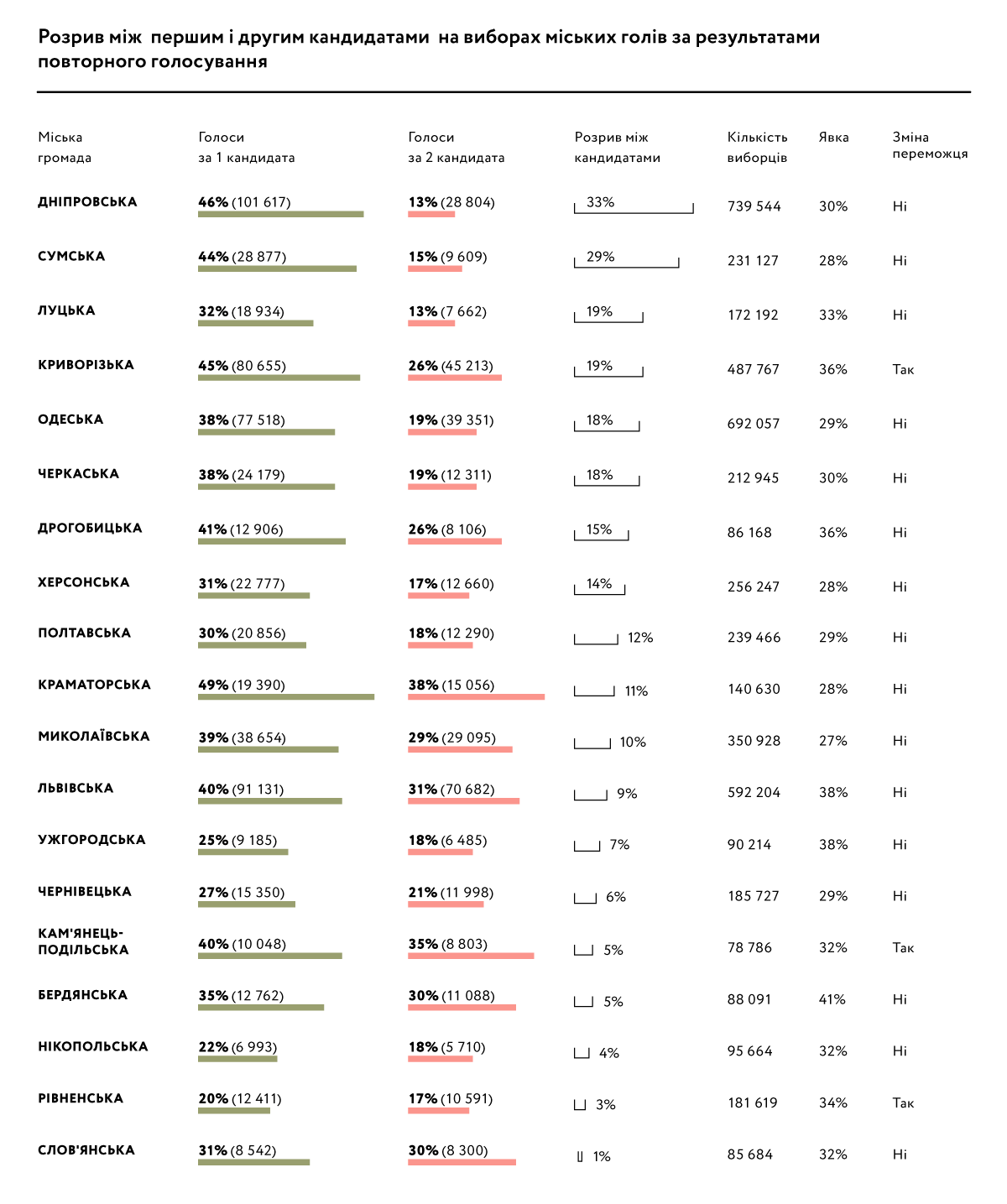 Нагадаємо, що на етапі розгляду проєкту Виборчого кодексу в першому читанні обговорювалася пропозиція не проводити другий тур голосування у випадку, якщо розрив між кандидатами у першому турі складатиме більше 20%. Однак у кінцевому варіанті Кодексу ця ідея не була втілена, хоча її реалізація дозволила б однозначно визначити переможців у першому турі ще в двох громадах. Так, на виборах Дніпровського міського голови розрив між кандидатами-лідерами в першому турі склав 33%, а на виборах Сумського міського голови — 29%. Крім того, понад 19% становив розрив між кандидатами на посаду голови міських громад Луцька і Кривого Рогу. Понад 18% різниці в голосах було між кандидатами в мери Одеси і Черкас. В усіх містах (за винятком Кривого Рогу), де відрив першого кандидата складав більше 6%, такі кандидати зберігали перевагу і на повторному голосуванні.
