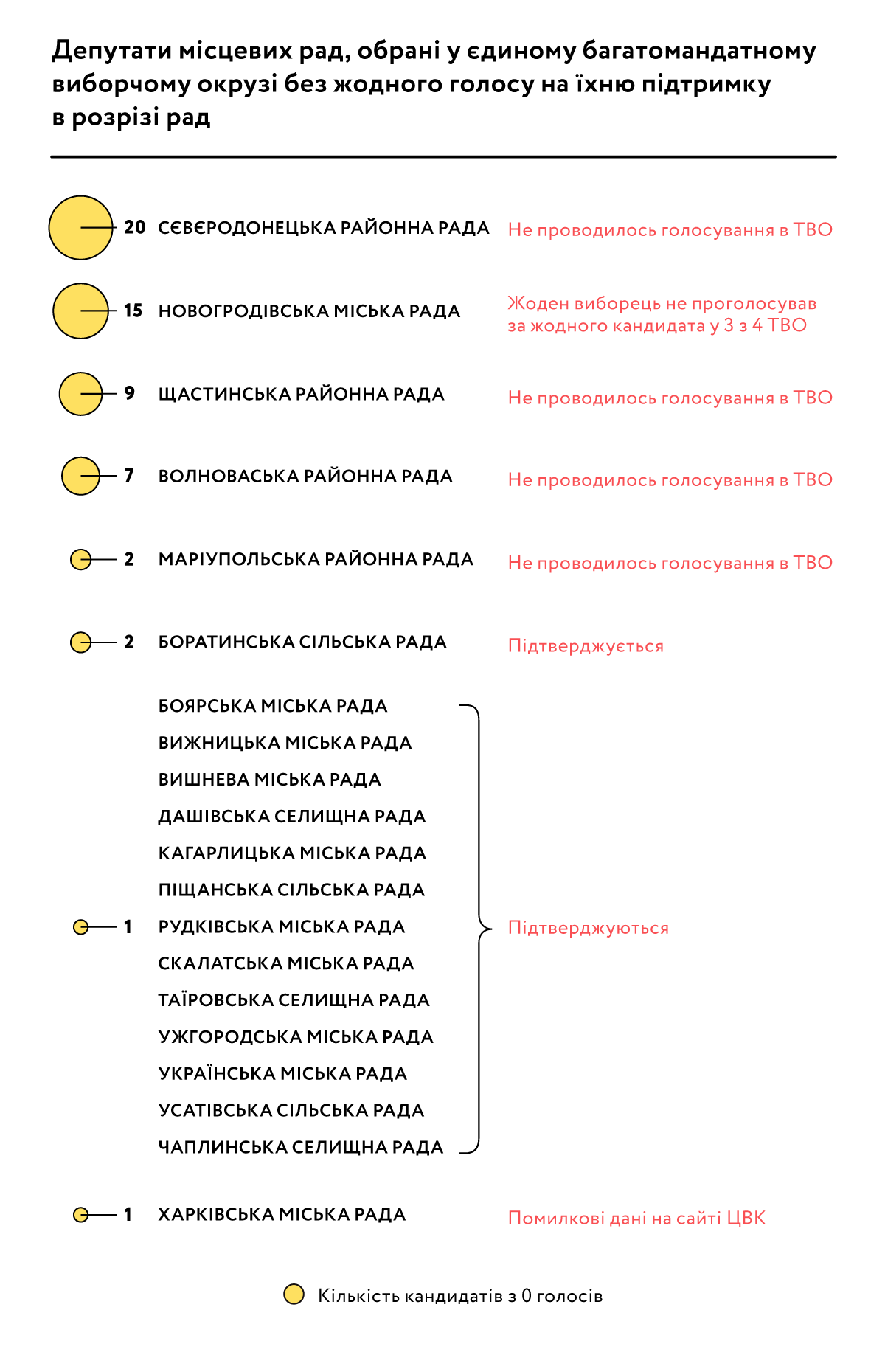 До загальної кількості обраних депутатів без жодного голосу на їхню підтримку входить 15 мандатів у Новогродівській міській раді. У цій громаді склалася специфічна ситуація, коли лише у 1 з 4 територіальних округів виборці голосували за конкретних кандидатів від організацій партій. Водночас голоси на підтримку всього виборчого списку партій у протоколах з округів були зафіксовані. Крім цього, на офіційному сайті ЦВК зазначено про відсутність голосів на підтримку одного з обраних в ЄБВО депутатів Харківської міської ради, хоча за даними протоколів він отримав 266 голосів. Дані про інших 15 депутатів, які не отримали голосів на їхню підтримку, підтверджуються.