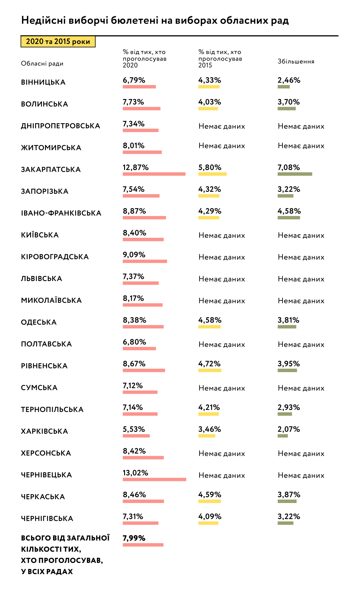 ОПОРА порівняла показники недійсних виборчих бюлетенів на виборах депутатів обласних рад 2015, 2020 рр. у розрізі 11 областей України (Закарпатська, Івано-Франківська, Рівненська, Черкаська, Одеська, Волинська, Запорізька, Чернігівська, Тернопільська, Вінницька, Харківська). В усіх областях, дані щодо яких наявні, відбулося зростання кількості недійсних виборчих бюлетенів. У двох регіонах (Закарпатська, Івано-Франківська області) частка недійсних виборчих бюлетенів збільшилась у понад два рази, в 6 областях — від 1,78 до 1,8 разу, у трьох — від 1,59 до 1,69 разу.