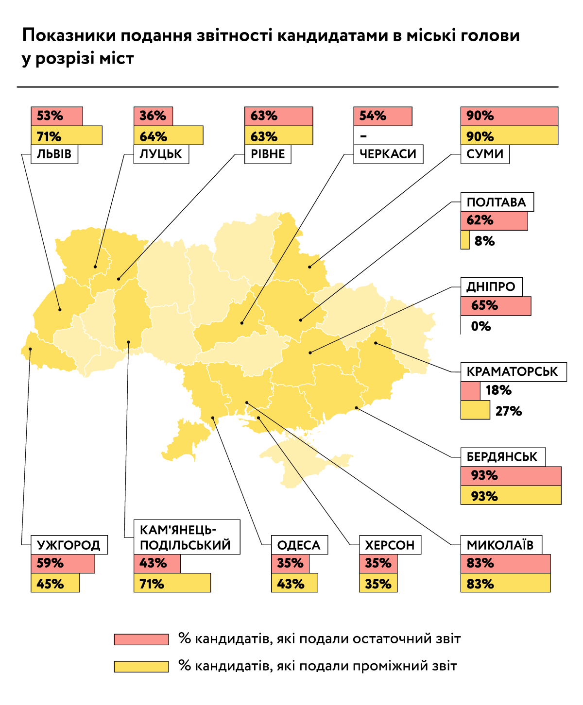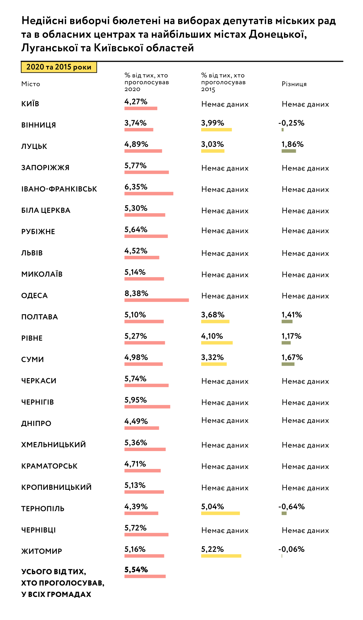 ОПОРА мала можливість порівняти результати минулорічної кампанії з місцевими виборами 2015 р. у 7 містах України (Вінниця, Луцьк, Полтава, Рівне, Суми, Тернопіль, Житомир). У порівнянні з місцевою кампанією 2015 року, показник недійсних бюлетенів зменшився у Вінниці та Тернополі, а також несуттєво у Житомирі. У 4 інших містах відсоток недійсних бюлетенів зріс: найбільше в Луцьку (1,6 рази), Сумах (1,5 рази).