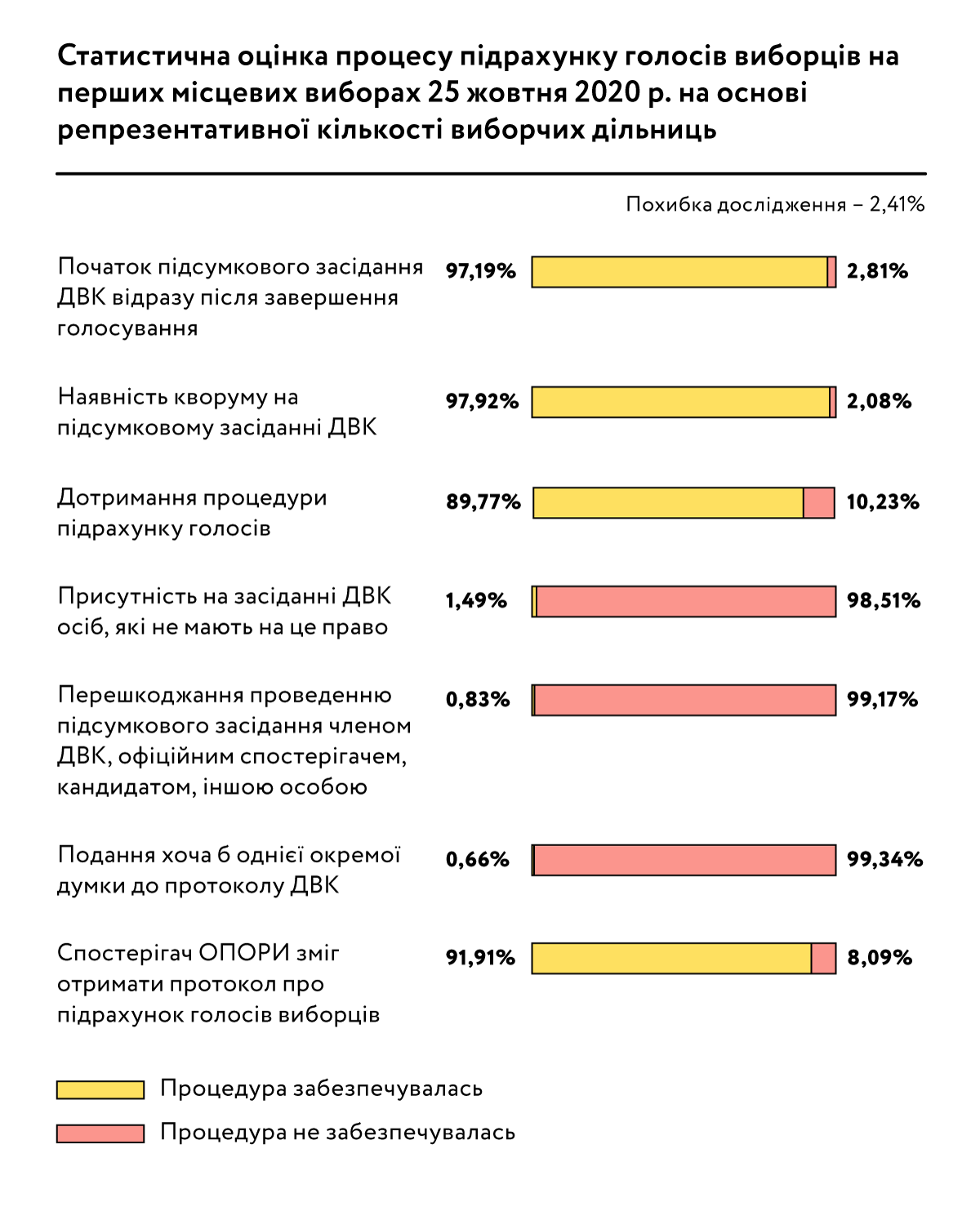 Ключовою проблемою в роботі ДВК після закриття виборчих дільниць стало недотримання членами виборчих комісій порядку підрахунку голосів. Такі випадки були зафіксовані на 10,23% виборчих дільниць, які входили до репрезентативної для України кількості виборчих дільниць (похибка дослідження — 2,41%). Порушення процедур підрахунку голосів необов’язково свідчили про протиправні наміри членів ДВК, а й були результатом недостатньої підготовленості членів виборчих комісій реалізовувати достатньо складні вимоги законодавства. Виявлені проблеми процесу практичної реалізації процедур на етапі підрахунку голосів засвідчують необхідність не лише належного навчання членів ДВК, а й системного аналізу доцільності спрощення процедур підрахунку голосів виборців зі збереженням необхідних гарантій цілісності процесу. Але, незважаючи на виявлені порушення процедури підрахунку голосів виборців, окремі думки були додані членами ДВК лише на 0,66%дільниць.