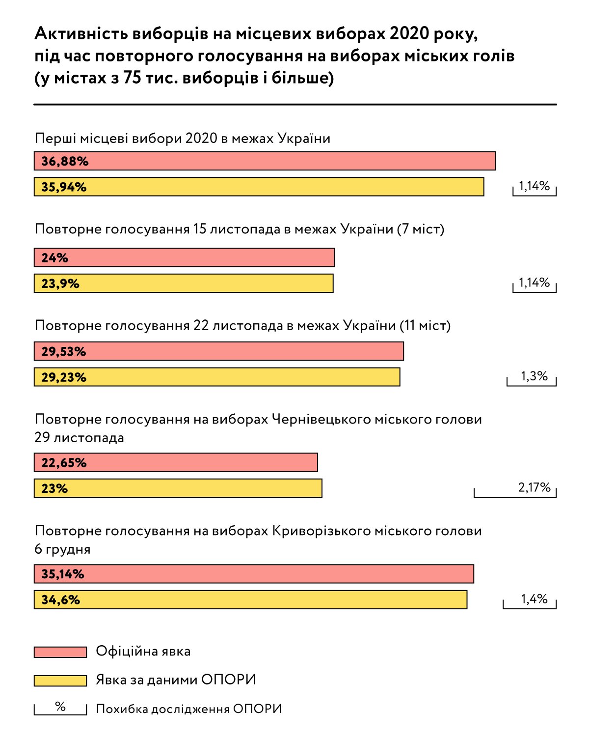 15 листопада 2020 року повторне голосування на виборах міських голів відбулося в 7 містах України різних регіонів України: Луцьк, Одеса, Суми, Херсон, Кам’янець-Подільський Хмельницької області, Краматорськ, Українка Київської області. Явка виборців, досліджена спостерігачами ОПОРИ на основі статистично репрезентативної для всієї України вибірки дільниць, у 7 містах України становила 23,9% із похибкою дослідження 1,14%. Відповідний показник для 11 міст України, в яких повторне голосування відбулось 22 листопада 2020 року, був дещо більшим — 29,23% із похибкою дослідження 1,3%. Після проведення повторного голосування у 18 містах України виборчий процес ще продовжувався у Чернівцях та Кривому Розі. На повторному голосуванні з виборів Чернівецького міського голови 29 листопада явка виборців становила 23% (похибка — 2,17%). Натомість на повторному голосуванні з виборів Криворізького міського голови активність громадян була значно вищою і лише несуттєво поступилась відповідному показнику голосування 25 жовтня 2020 року (34,60% при похибці дослідження 1,4%).