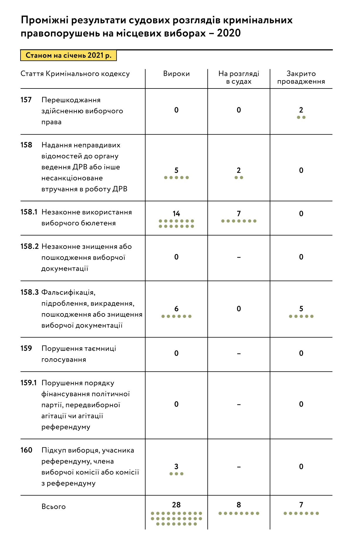 Місцеві вибори — 2020, проведені на основі нового законодавства, сформували перелік нових завдань у процесі забезпечення повної відповідності українського виборчого процесу найкращим демократичним стандартам. Виявлені недоліки законодавства та незадовільні практики мали серйозний характер, які, втім, не перекреслюють досягнення України у сфері забезпечення виборчих прав громадян та вдосконалення низки виборчих процедур. Остаточна оцінка прогресу або, навпаки, певного регресу України на шляху зміцнення інституту виборів може бути сформована лише після завершення розслідування всіх виборчих злочинів, які розслідуються правоохоронними органами. Напередодні місцевих виборів 2020 року Верховна Рада України шляхом внесення змін до Кримінального кодексу та Кодексу про адміністративні правопорушення продемонструвала власну спрямованість на забезпечення невідворотності покарання за виборчі злочини. Натомість результати розслідування правопорушень показують, чи ефективно були використані нові правові можливості.