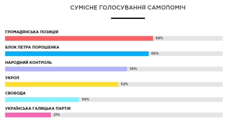 Показник сумісності голосувань цих двох фракцій між собою за весь період роботи ради сьомого скликання складає 48%, що радше свідчить про подібність моделей поведінки фракцій у сесійній залі, ніж про усталену постійну опозиційну стратегію двох сил. При цьому, очевидно, що попри періодичну критику більшості, голосування депутатів фракції «Громадський рух «Народний контроль» на 59%, а УКРОПу на 55% сумісне із голосуванням «Громадянської позиції» і на 56% та 52% відповідно - з голосуванням Об’єднанням «Самопоміч». Через це можна зробити висновок, що гнучка й ситуативна модель поведінки обох цих партій ближча до позиції умовної більшості, аніж до опозиції.