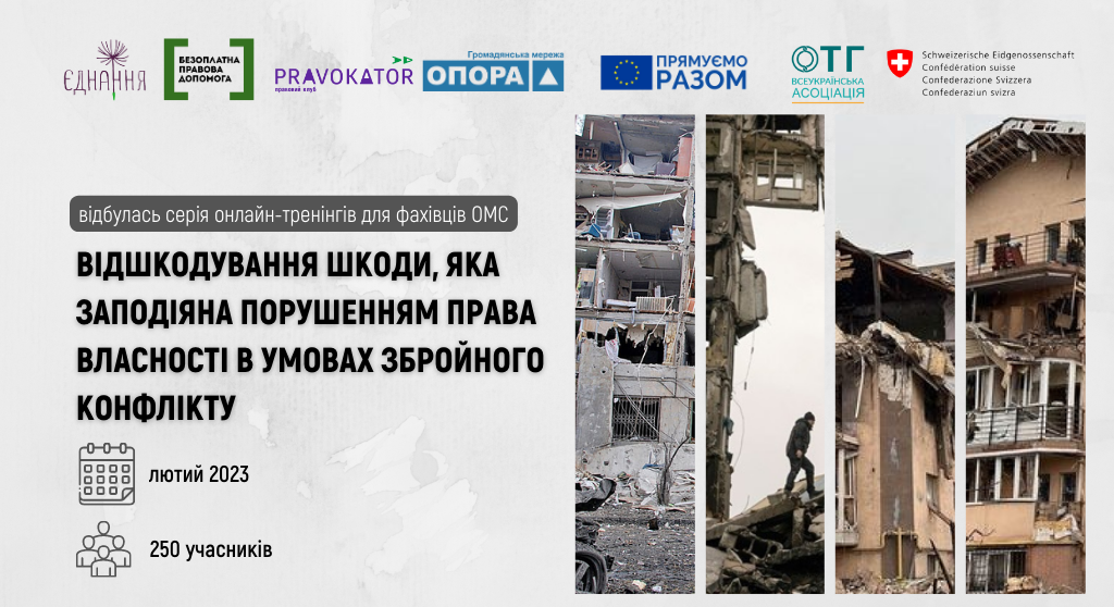 Координаційний центр з надання правової допомоги спільно з Київським міським осередком Всеукраїнської громадської організації «Громадянська мережа ОПОРА» та Всеукраїнською асоціацією ОТГ організував проведення серії регіональних онлайн-тренінгів для фахівців органів місцевого самоврядування “Відшкодування шкоди, яка заподіяна порушенням права власності в умовах збройного конфлікту”.